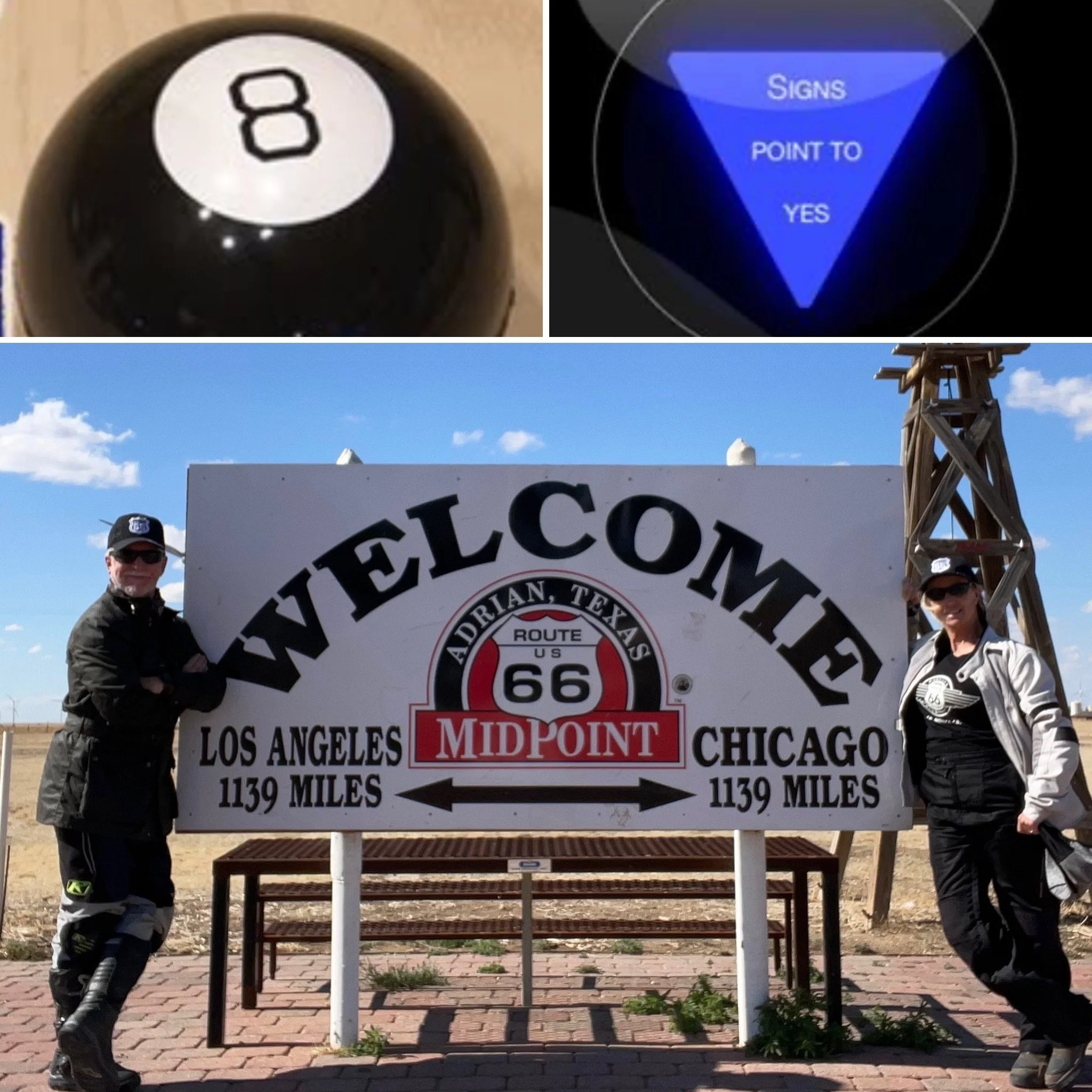 Call it what you want, cabin fever, restlessness, fender frustration, or just plain stir crazy… our desire to get back out on the Mother Road has brought us to this: Consulting a Magic 8 Ball ✨🎱✨ for direction. That said, let’s toss it in the tank bag and head out to the center of our quest, Adrian, Texas, and all of the signs in-between.