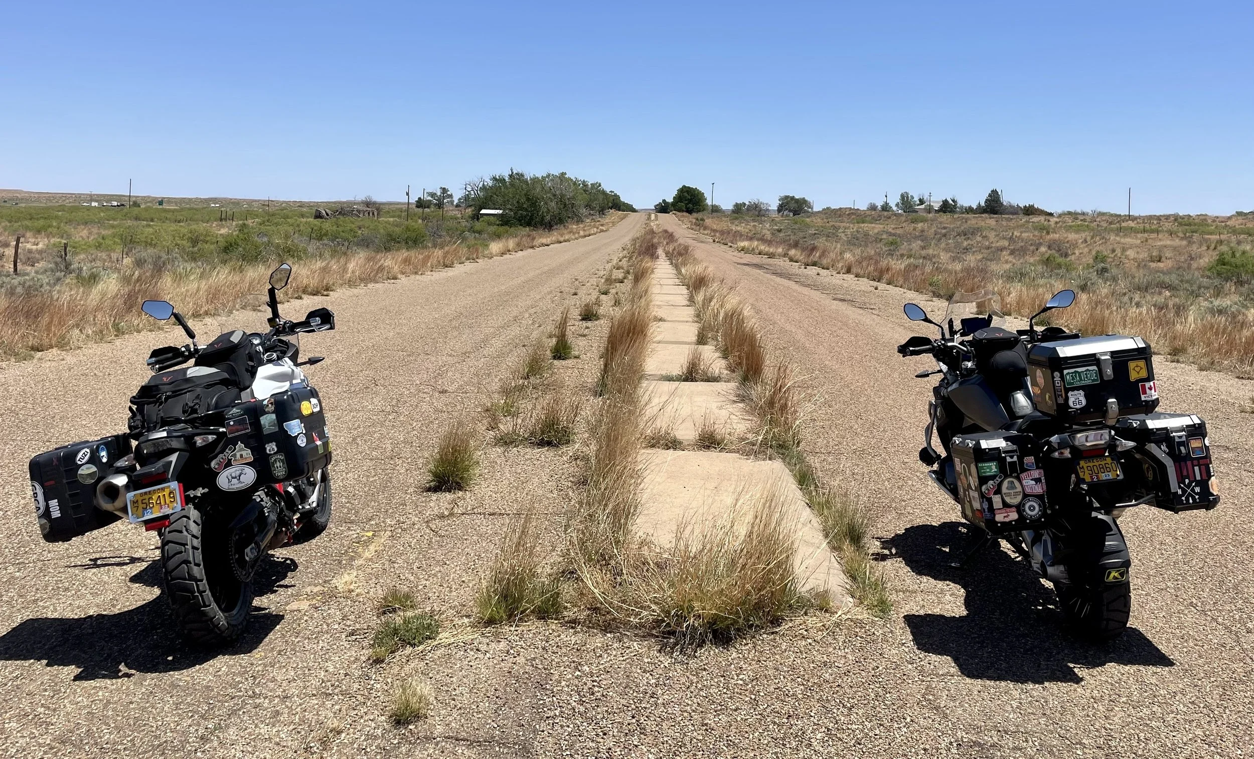 It is with a full tank and with the confidence of our trusted source that we venture on. San Jon to Glenrio was an adventure unto itself. This is OLD road, almost all of it dirt and gravel wash. Aren’t we glad we put those Dunlop Trail Max tires on?