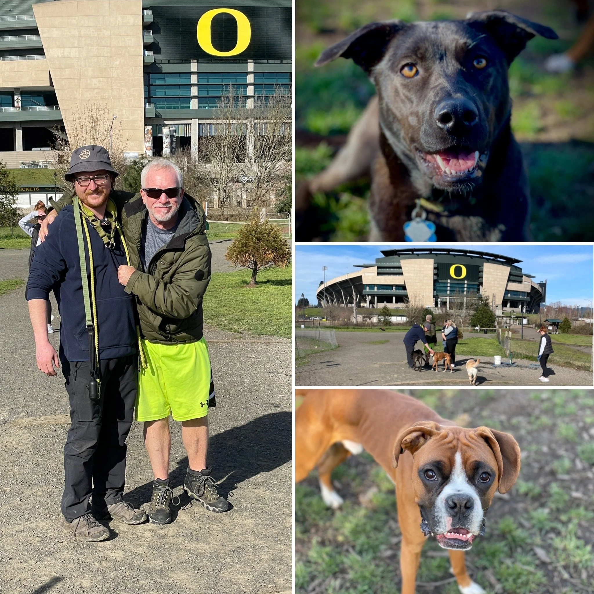 Alton Baker Dog Park in Eugene: Left to right: Connor, John, Brandy, and Earl!