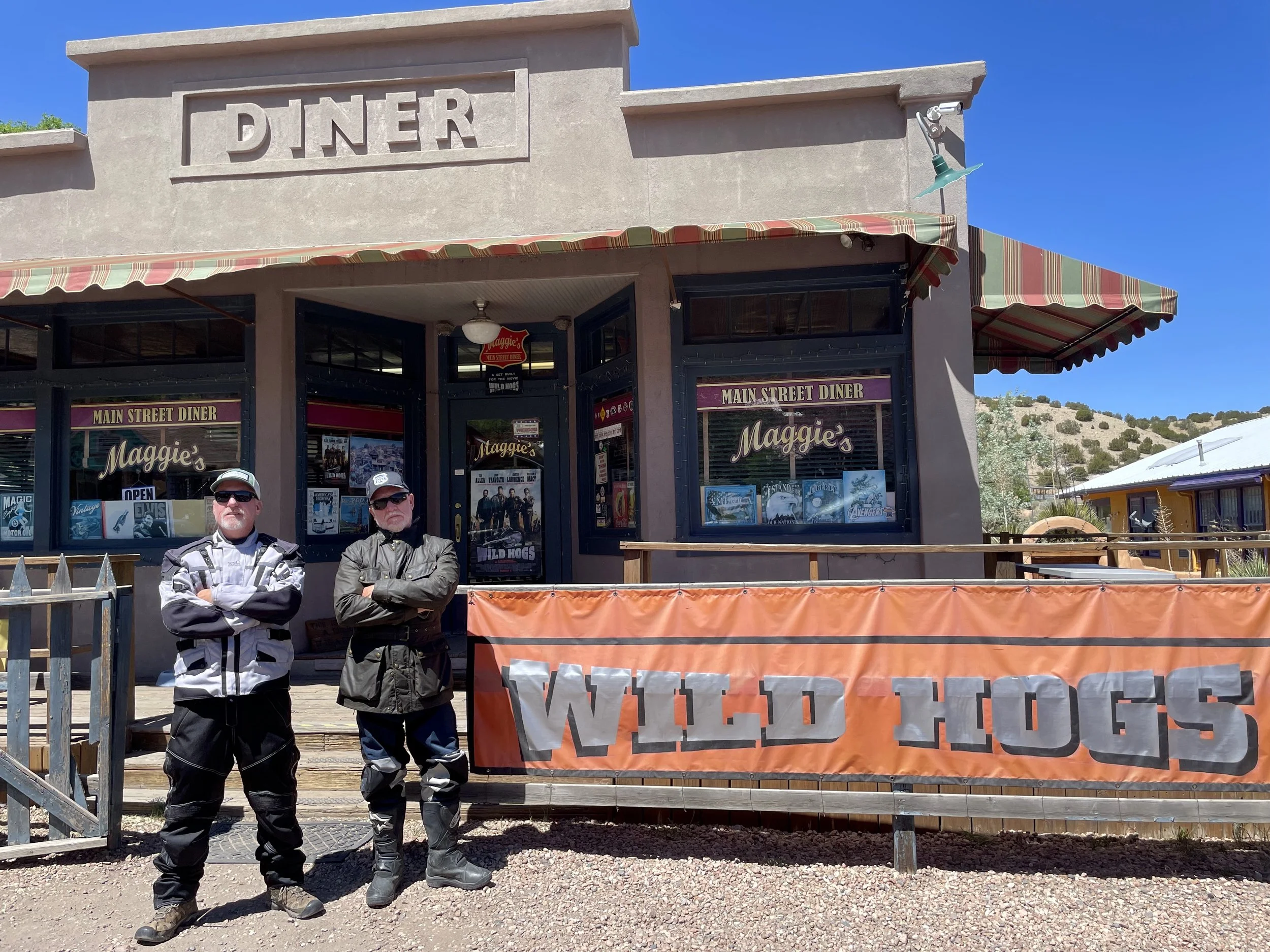 Our next ride was with our friends ,Scott and Genevieve, down ⬇️ and up ⬆️ the Sandia Crest to Sante Fe including Madrid, yes, that Madrid from “Wild Hogs.” This sleepy little village existed long before Hollywood descended on it years ago, but now this town thrives on the connection to John Travolta and Tim Allen. The purchase of a Del Fuego’s shirt for John from Maggies and we hit the road. “I just wanna ride man, I just wanna ride!” 🏍 And ride we do, splitting the fires that dot the hillside of Los Alamos and Las Vegas.