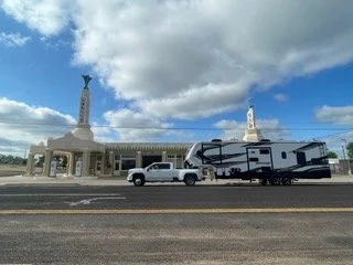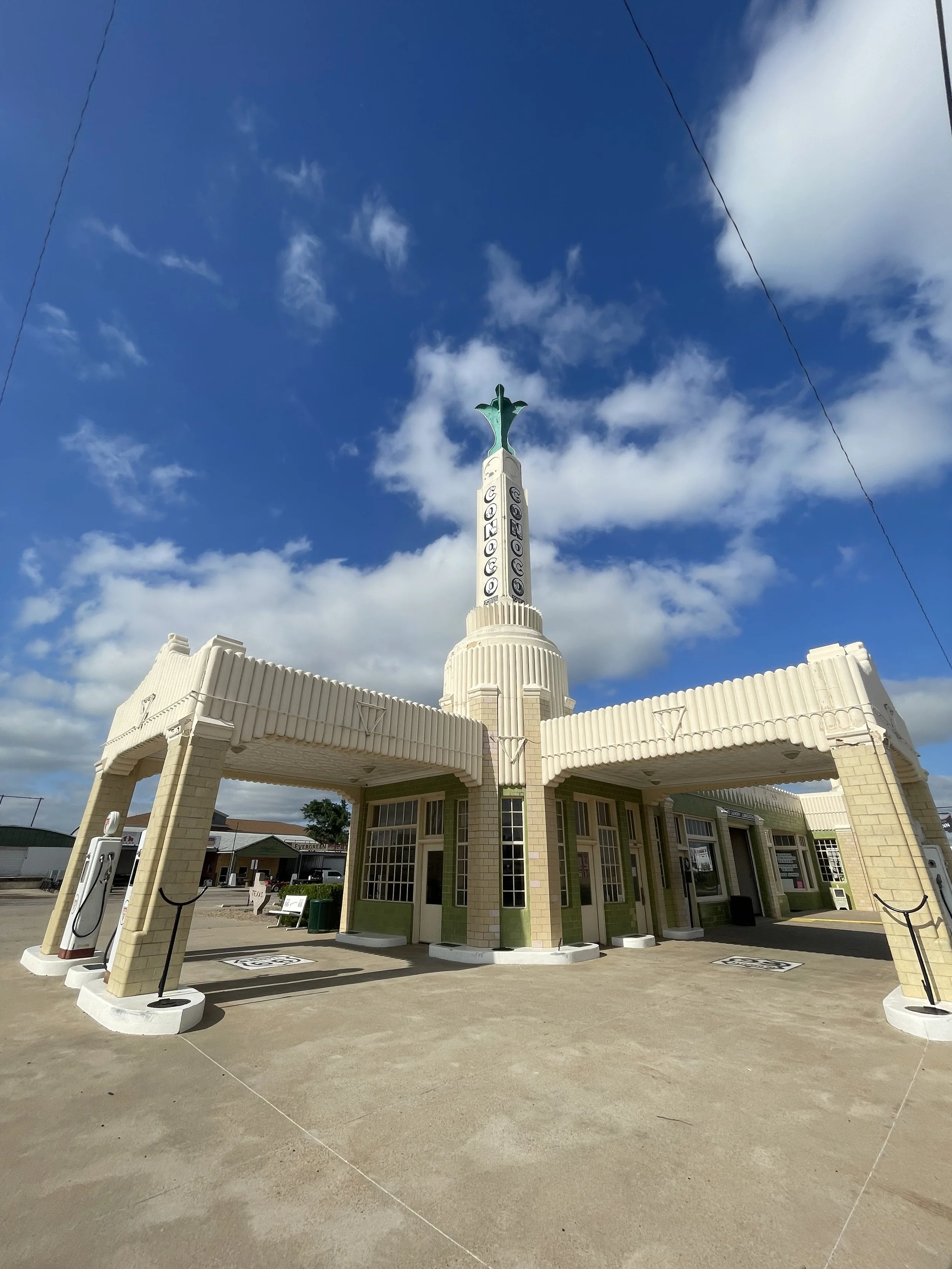 Our path to Springfield and the BMW MOA Motorcycle Rally begins in Shamrock... IN the Grand Shamrock... the affectionate name we call our RV. The Conoco Station here is one of the best examples of Art Deco architecture that we have seen along the road. The smiles on our faces betrayed the fact that our truck and RV are as long as the service stations that once met the travelers before us.