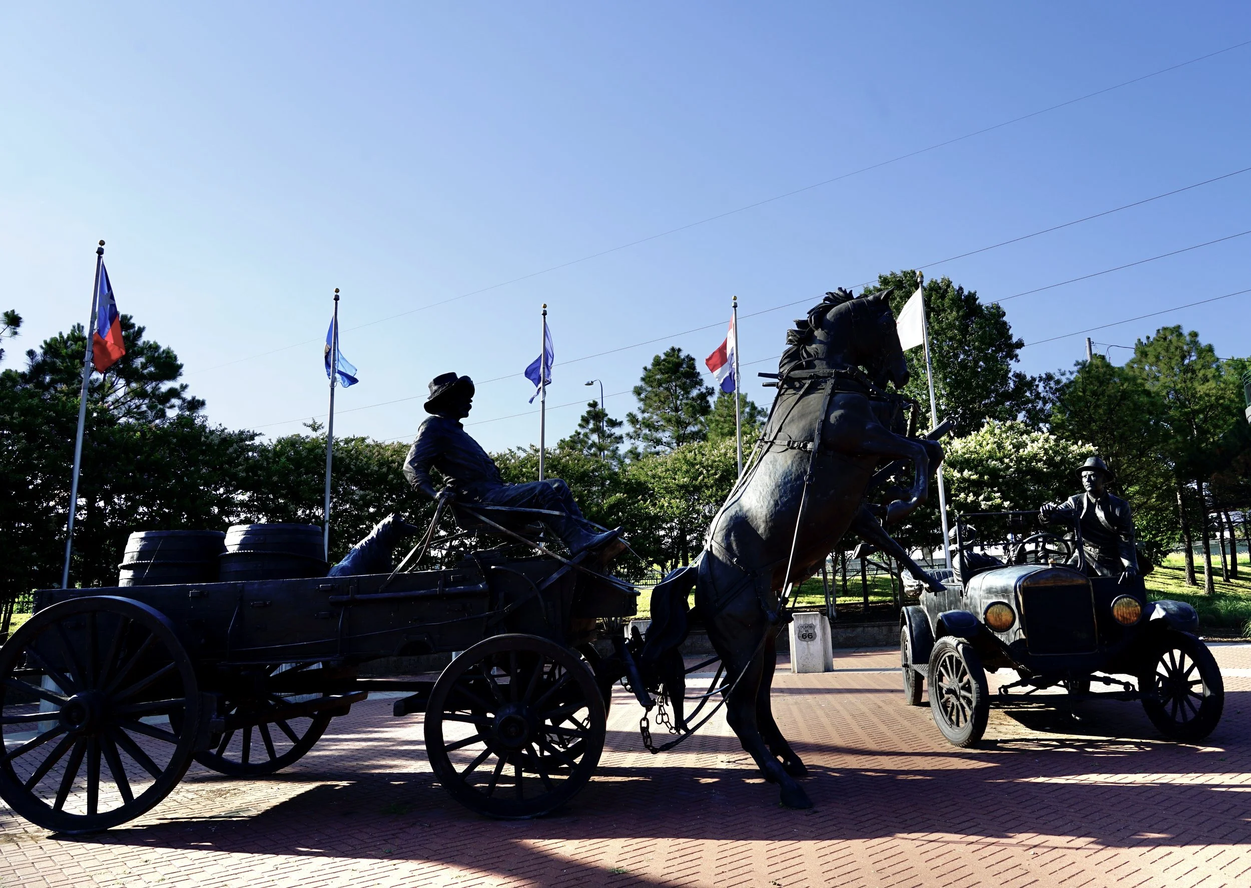As a seven year old, John, like most boys of an era, was fascinated with the TV series “Land of the Giants.” The real location of this fictional place is this stretch of highway, “ Our Highway”, 66 from Tulsa to Catoosa. The Cyrus Avery Monument Bridge was instrumental in carrying travelers across the Arkansas River, and is recognized as such with the sculpture “East Meets West” with the Giant Horse Drawn Wagon startled by Henry Ford’s Model T. Photo above.
